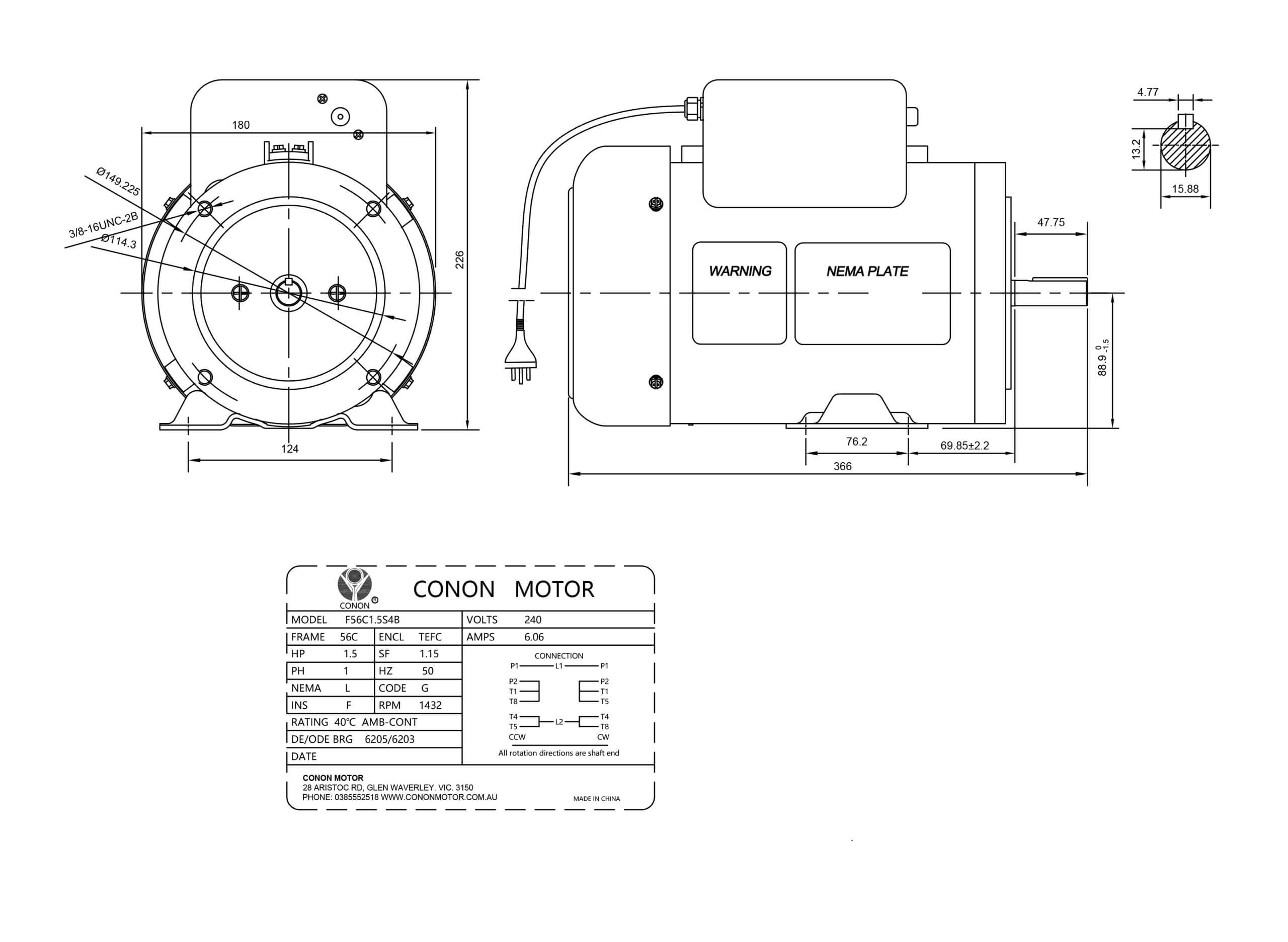 Single Phase NEMA Electric Motor 240V 1.1kW1.5HP 1400rpm FRAME 56 1Ph CSCR 5/8"